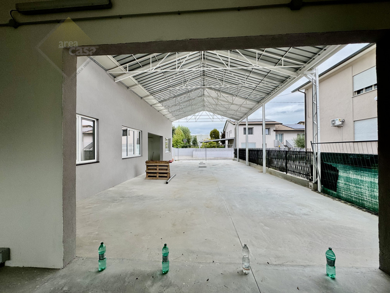 All’esterno troviamo un’ampia area privata protetta da tettoia metallica nuova, ideale come parcheggio coperto oppure zona carico/scarico merci; l’ingresso pedonale curato offre privacy grazie alla recinzione moderna mentre le fioriere donano un tocco verde all’ambiente circostante. Nessuna spesa condominiale prevista!